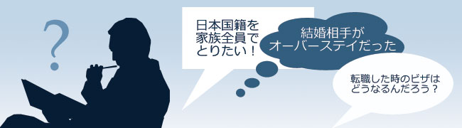 在留資格、戸籍、国籍についてお悩みの外国人の方、外国人の雇用を検討している企業、事業主の皆様に的確な情報提供とスピーディーな手続き代行を行っています。お客様のお悩み解決をお手伝いできる日を心待ちにしております。
